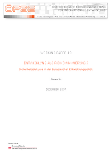 Sicherheit und Entwicklung sind auf eine sehr nahe liegende Art und Weise mit einander verknüpft: ohne ein Mindestmaß an Sicherheit kann Entwicklung nicht stattfinden; Entwicklung selbst ist ein wesentlicher Beitrag zur Herstellung und zum Erhalt von (menschlicher) Sicherheit in einem umfassenden Sinn. Dieses Working Paper interpretiert die zunehmende "Versicherheitlichung" von Entwicklung und die "developmentalisation" von Sicherheit als einen Paradigmenwechsel in der politischen Ausrichtung der Entwicklungszusammenarbeit und erörtert am Beispiel der Außenbeziehungen der EU die unterschiedlichen "Risiken", die sich für entwicklungspolitische Zielsetzungen daraus ergeben.