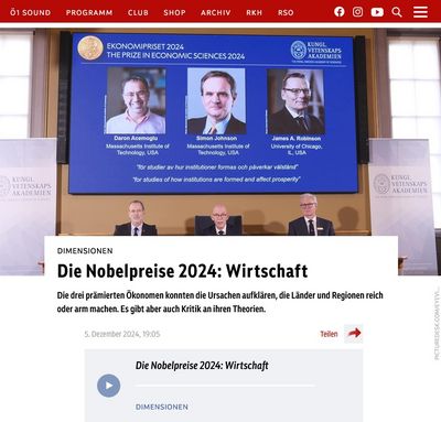 Das Ö1-Wissenschaftsmagazin Dimensionen beleuchtete letzte Woche die Nobelpreisträger*innen 2024. In der Ausgabe vom 5. Dezember steuerte ÖFSE-Leiter Werner Raza seine Expertise zu den Preisträgern des Wirtschaftsnobelpreis 2024 bei. Nachzuhören ist die Sendung hier.