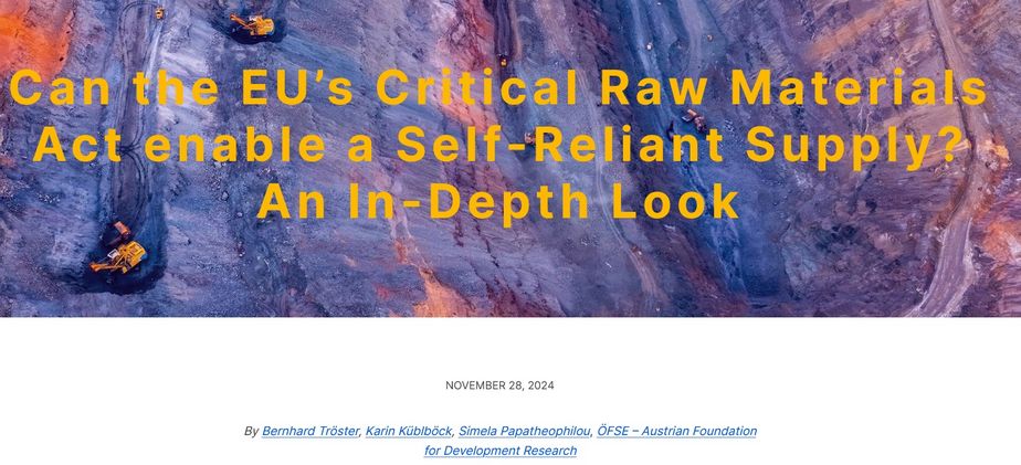 Die ÖFSE-Rohstoffexpert*innen Karin Küblböck, Simela Papatheophilou und Bernhard Tröster haben für den Blog der Rohstoffplattform „Beyond Hot Air“ einen ausführlichen Blick auf den EU Critical Raw Materials Act (CRMA) geworfen. Sie haben sich gefragt, ob das Gesetz Europa im Bereich kritischer Rohstoffe autark machen kann oder ob es ein neokoloniales Modell des Ressourcenverbrauchs aufrechterhält. Den Blogpost können Sie hier lesen.