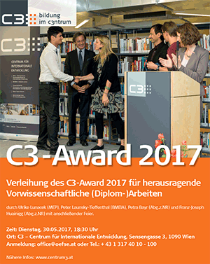 Das Centrum für Internationale Entwicklung wird am 30.05.2017 die PreisträgerInnen der diesjährigen Ausschreibung des C3-Awards auszeichnen. Über 90 SchülerInnen aus ganz Österreich haben in diesem Jahr ihre Arbeiten eingereicht. Die fünf entwicklungspolitischen Organisationen im C3 (ÖFSE, BAOBAB, Frauen*solidarität, Paulo Freire Zentrum und Mattersburger Kreis für Entwicklungspolitik) freuen sich darauf, die ausgewählten vorwissenschaftlichen (Diplom)Arbeiten im Rahmen eines Festaktes vorzustellen und zu prämieren! Für die musikalische Umrahmung sorgt die Gruppe Satuo. Der Festakt findet im Foyer des Centrums für Internationale Entwicklung statt.